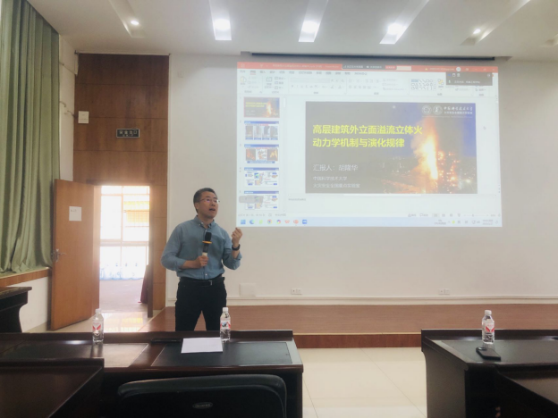 高層建筑外立面立體火災(zāi)是城市火災(zāi)與公共安全的重要挑戰(zhàn)。胡教授從室內(nèi)火災(zāi)行為、外立面火溢流臨界理論、火溢流特征參數(shù)演化和城市大尺度高層建筑立體火等四個(gè)層面,對(duì)環(huán)境風(fēng)作用下高層建筑火災(zāi)燃燒行為進(jìn)行了系統(tǒng)介紹,為師生講解了環(huán)境風(fēng)、低壓、不同外墻結(jié)構(gòu)等邊界條件下的開(kāi)口火溢流及外立面立體火行為,揭示了外立面火溢流發(fā)生機(jī)制、火焰高度、溫度、熱流分布等參數(shù)的數(shù)理模型及城市大尺度災(zāi)害演化機(jī)理。