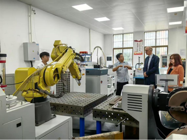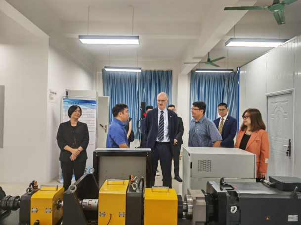 9月17日上午,英國諾丁漢大學副校長、馬來西亞分校校長兼首席執(zhí)行官大衛(wèi)·菲茨帕特里克校長(David FitzPatrick)率馬來西亞分校代表團一行五人來訪我院,廣西市長協(xié)會對外聯(lián)絡員宋益銘,校國際交流與合作處處長廖文丹、副處長郭宇路陪同參觀,一同考察工程訓練中心智慧車間、 廣西新能源車輛動力電池與綠色動力域重點實驗室以及廣西制造系統(tǒng)與先進制造技術重點實驗室。學院黨委書記盧嬋江、院長賀德強、君武學者龍雨、能源與動力工程系主任歐陽天成、工程訓練中心主任鄭炳年等接待來訪,秦智鵬副教授擔任翻譯。