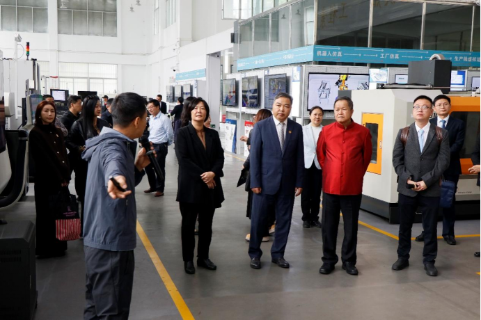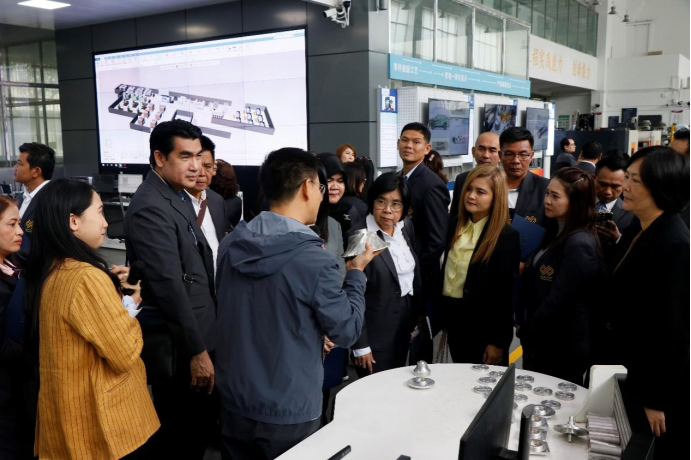 為進(jìn)一步深化廣西與泰國教育交流與合作,推動構(gòu)建更為緊密的中國—東盟命運共同體,10月23日,由自治區(qū)教育廳舉辦的“人工智能在教育領(lǐng)域的應(yīng)用”中泰教育交流會在我校舉行,泰國暖武里府行政機(jī)構(gòu)主席通猜·贏布拉瑟上校(Pol.Col.Thongchai Yenprasent)帶領(lǐng)由泰國32所大、中、小學(xué)校的校長組成的泰國暖武里府政府及朱拉隆功大學(xué)代表團(tuán)的44位成員到我院參觀中國—東盟智能制造技術(shù)創(chuàng)新學(xué)院。泰國暖武里府行政組織副主席Miss Issaya Sathornsantikul(依薩雅.薩通散迪昆)、泰國暖武里府教育廳廳長?Miss Nataraporn Pichayagorn(娜塔拉蓬·皮查亞功)、自治區(qū)教育廳對外合作與交流處一級調(diào)研員呂青、廣西教師培訓(xùn)中心(廣西外語培訓(xùn)中心)對外交流與合作部部長唐燕艷等自治區(qū)教育廳、南寧市教育局、廣西高校及南寧市中小學(xué)代表等教育界代表一同參觀。廣西大學(xué)副校長肖建莊、國際合作與交流處處長廖文丹及副處長郭宇路、龔衛(wèi)華全程陪同。學(xué)院黨委書記盧嬋江、黨委副書記黃路明、副院長李俚、黃豪中、莫帥、陳宏波等院領(lǐng)導(dǎo)全程接待。