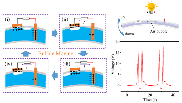 近日,我院助理教授李昌錚團(tuán)隊(duì)開發(fā)了一種基于液體中移動(dòng)氣泡的新型摩擦納米發(fā)電機(jī)(B-TENG),當(dāng)體積僅有1.08 cm3的小氣泡在充水聚四氟乙烯(PTFE)管中緩慢移動(dòng)時(shí),可以產(chǎn)生高達(dá)17.5 V的開路電壓,其經(jīng)過600次工作循環(huán)后依舊表現(xiàn)出持續(xù)穩(wěn)定的輸出特性。此次工作對B-TENG的摩擦發(fā)電機(jī)理及電荷轉(zhuǎn)移機(jī)制、裝置的負(fù)載特性及影響因素進(jìn)行了系統(tǒng)的研究。研究成果以“Triboelectric nanogenerator based on a moving bubble in liquid for mechanical energy harvesting and water level monitoring”為題發(fā)表在國際著名期刊《Nano Energy》上,我院為第一單位及通訊單位,李昌錚助理教授為第一作者和通訊作者,2019級碩士研究生劉緒陽等完成主要工作。