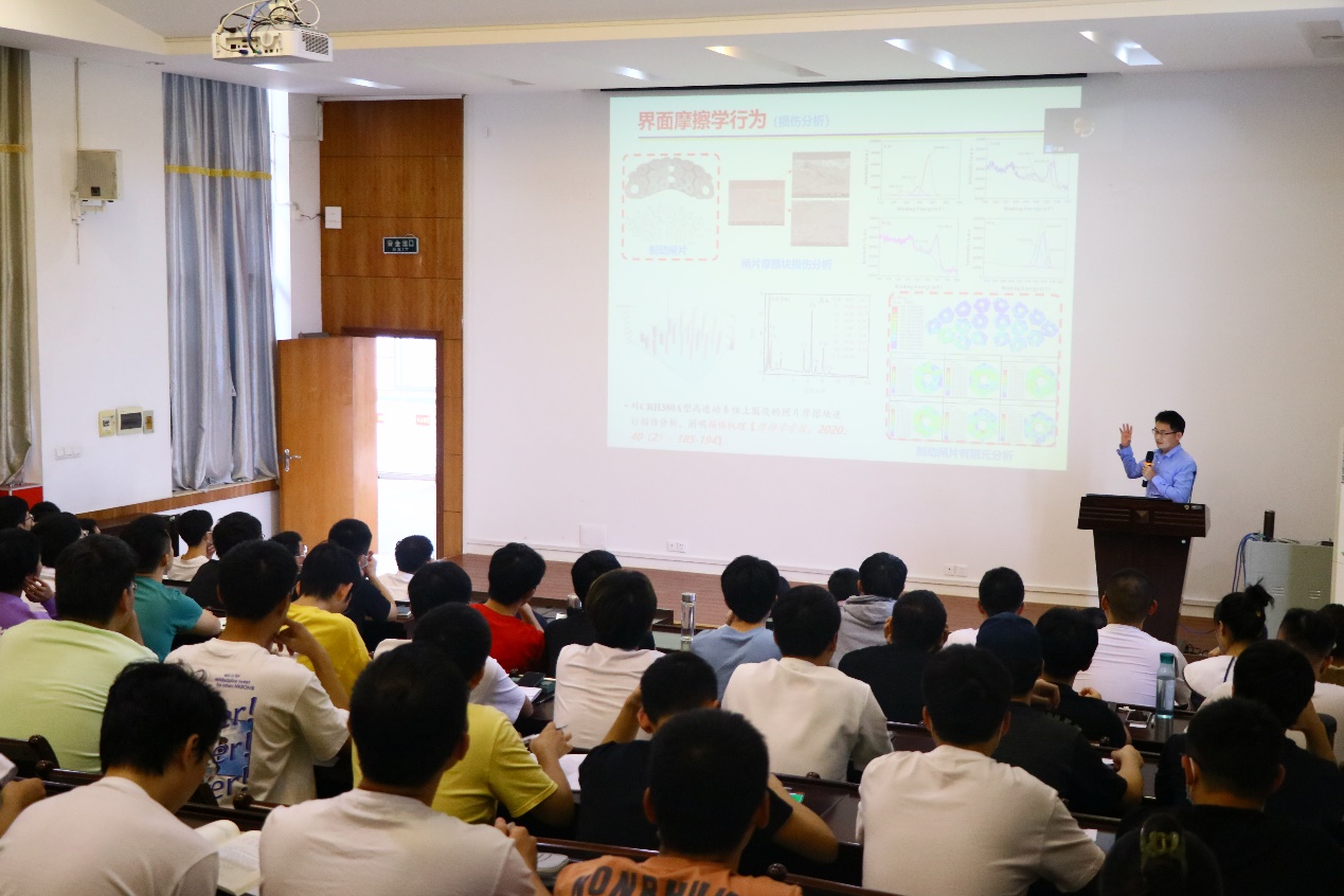 項(xiàng)老師從課題的研究背景、制動(dòng)界面摩擦學(xué)行為及調(diào)控、基礎(chǔ)理論研究的工程化應(yīng)用等四個(gè)方面展開講授,深入淺出地闡述了高鐵基礎(chǔ)制動(dòng)部分存在的界摩擦行為研究現(xiàn)狀,重點(diǎn)強(qiáng)調(diào)了摩擦學(xué)行為調(diào)控及一些工程問題的解決方案,為師生呈現(xiàn)了一場(chǎng)精彩的學(xué)術(shù)報(bào)告。提問環(huán)節(jié),同學(xué)們踴躍發(fā)言,針對(duì)同學(xué)們提出的論文選題的切入點(diǎn)、不同條件高鐵制動(dòng)閘片的選擇等問題,項(xiàng)載毓逐一進(jìn)行了詳細(xì)的解答。