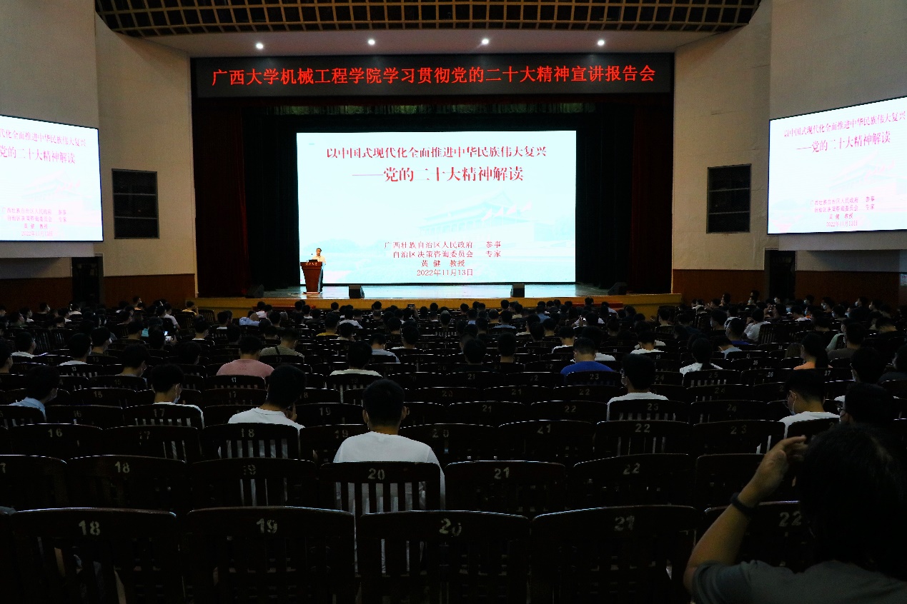 為引導(dǎo)全院師生深入學(xué)習(xí)貫徹黨的二十大精神,11月13日晚,學(xué)院黨委在廣西大學(xué)大禮堂召開學(xué)習(xí)貫徹黨的二十大精神宣講報告會。報告會邀請廣西壯族自治區(qū)人民政府參事、自治區(qū)決策咨詢委員會專家黃健教授作題為《以中國式現(xiàn)代化全面推進(jìn)中華民族偉大復(fù)興——黨的二十大精神解讀》的宣講。全院師生黨員及發(fā)展對象共四百多人參加報告會。院黨委副書記黃路明主持報告會。