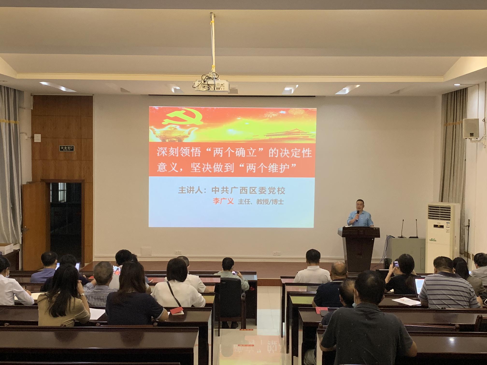 兩支部邀請到中共廣西區(qū)委黨校(廣西行政學院)哲學教研部主任、廣西壯族自治區(qū)黨委講師團特聘專家李廣義教授講授以《深刻領悟“兩個確立”的決定性意義,堅決做到“兩個維護”》為主題的黨課,深入學習黨的二十大精神。李教授從“兩個確立”決定性意義的理論和實踐邏輯;完整準確把握“兩個確立”的內涵要求;堅持“兩個確立”,做到“兩個維護”,開創(chuàng)新時代壯美廣西建設新局面三個方面,深刻解讀了“兩個確立”和“兩個維護”重要意義。黨員教師參會黨員專心聽講,認真記錄。