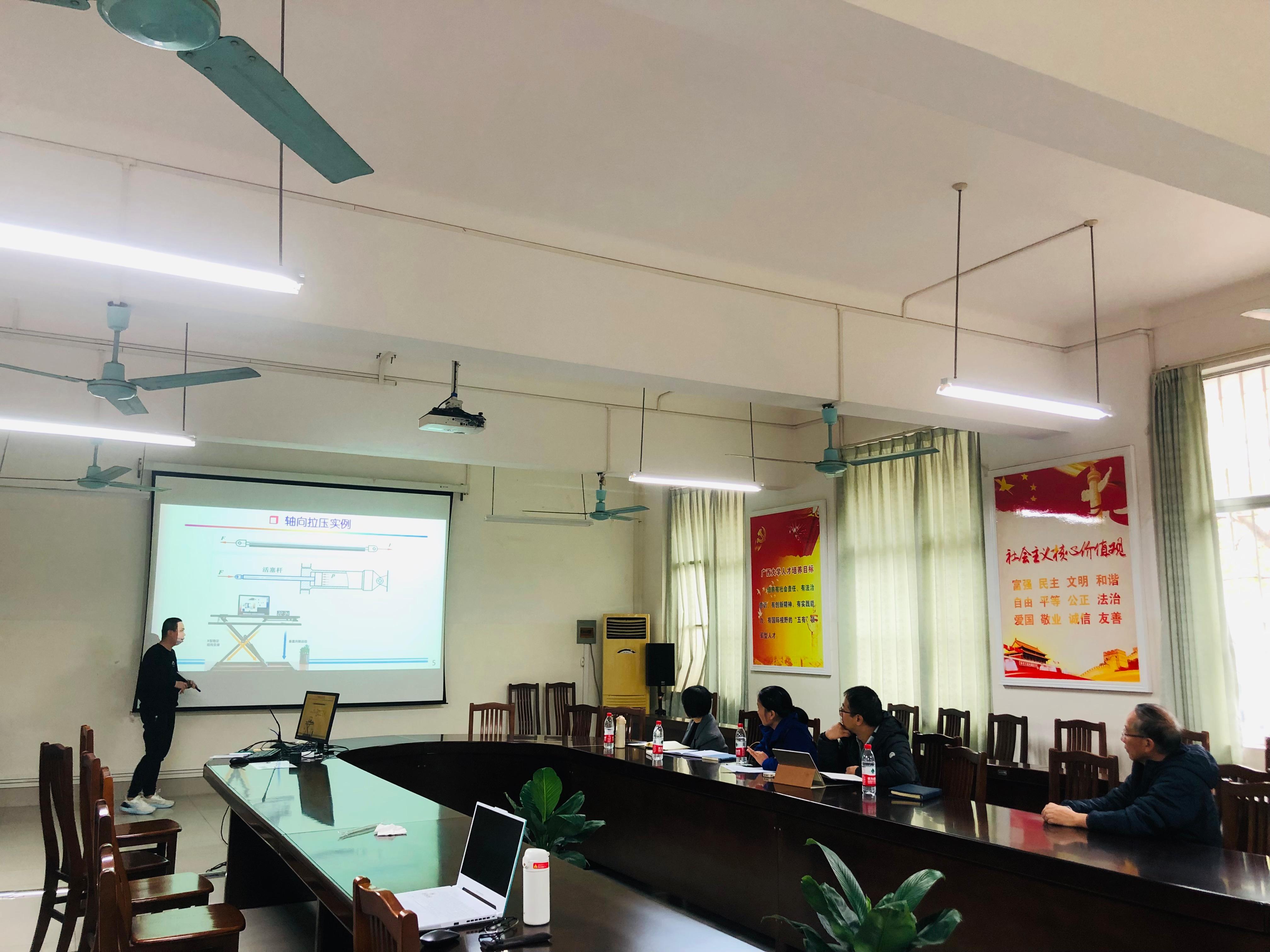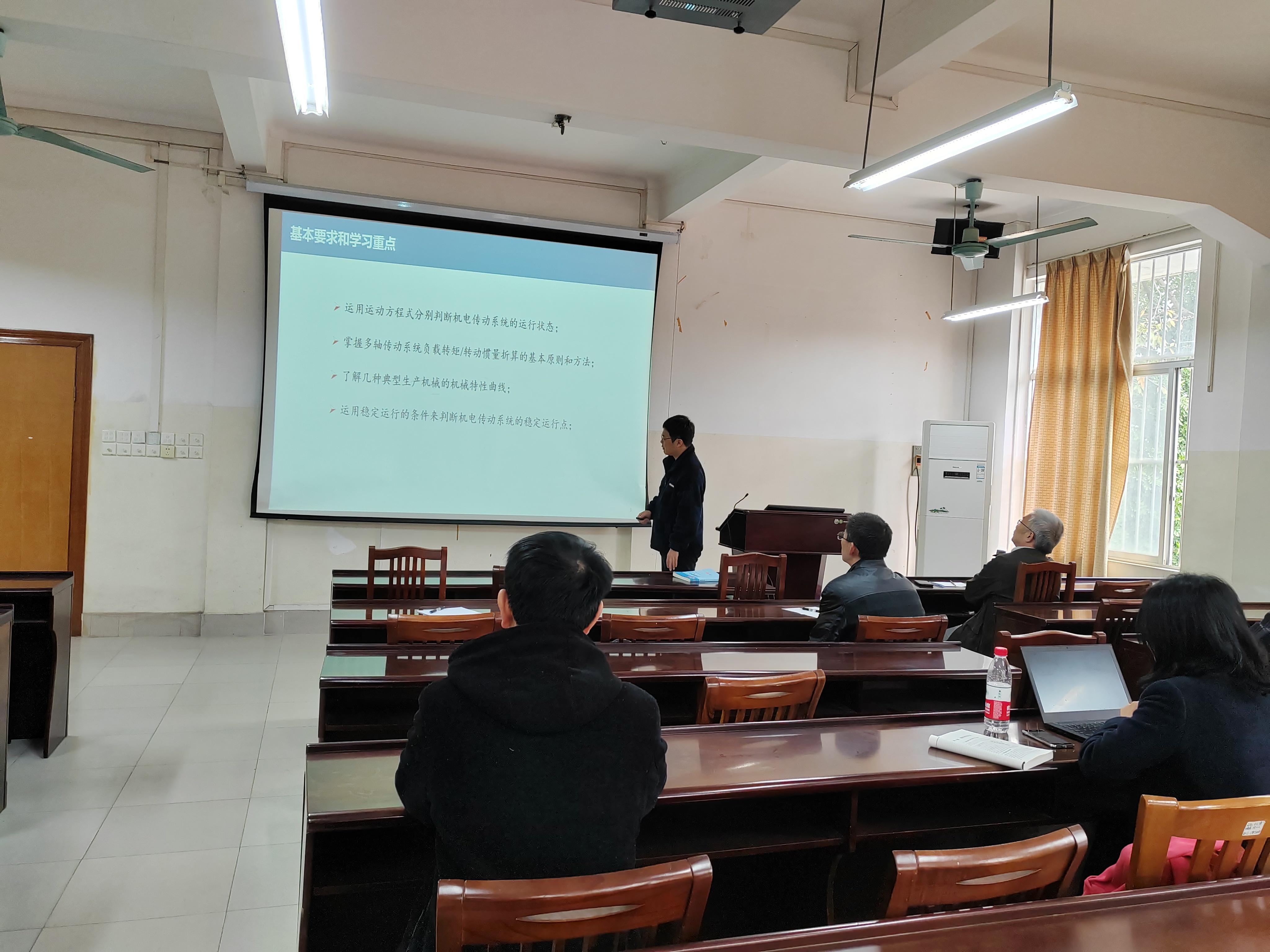 近兩年新入職的項(xiàng)載毓、劉黎明、李琴、陸志恒、徐敏敏、蓋倞堯、李宏偉、周柱坤、梁科、唐偉力、梁立喆、莫唐明、李嘉寶、董天云和魏偉等15位新教師分成3個(gè)小組,通過多媒體手段,分別試講了《工程制圖(非機(jī)類)》、《互換性與技術(shù)測(cè)量》、《工程管理與技術(shù)經(jīng)濟(jì)學(xué)》、《材料力學(xué)》、《工程力學(xué)(一)》、《機(jī)電傳動(dòng)控制》、《單片機(jī)原理及其應(yīng)用》、《機(jī)械電氣自動(dòng)控制》、《創(chuàng)新設(shè)計(jì)方法與實(shí)踐》、《熱工學(xué)基礎(chǔ)》、《制冷技術(shù)與原理》、《傳感與檢測(cè)技術(shù)》和《機(jī)械電子控制》等多門課程。