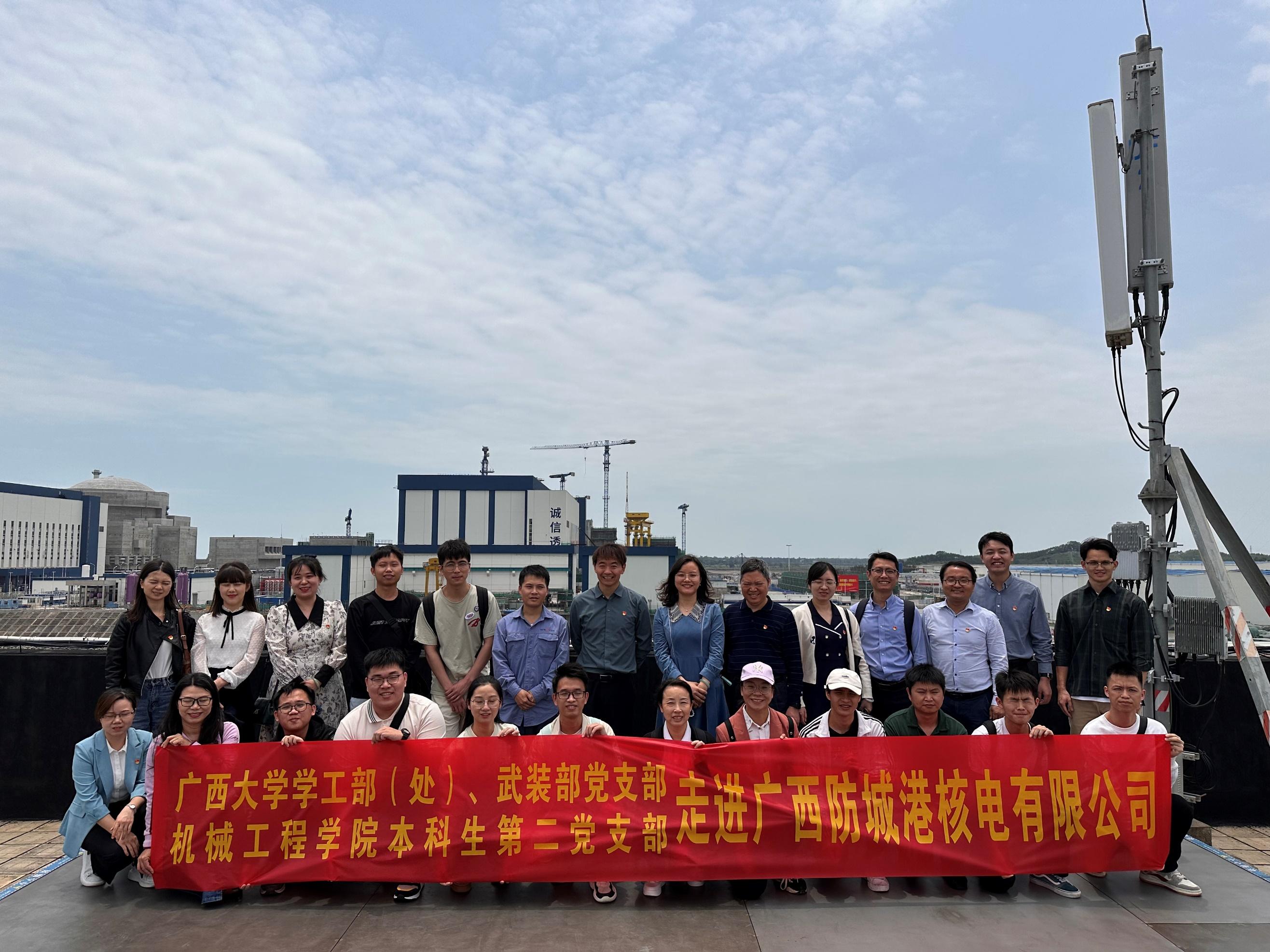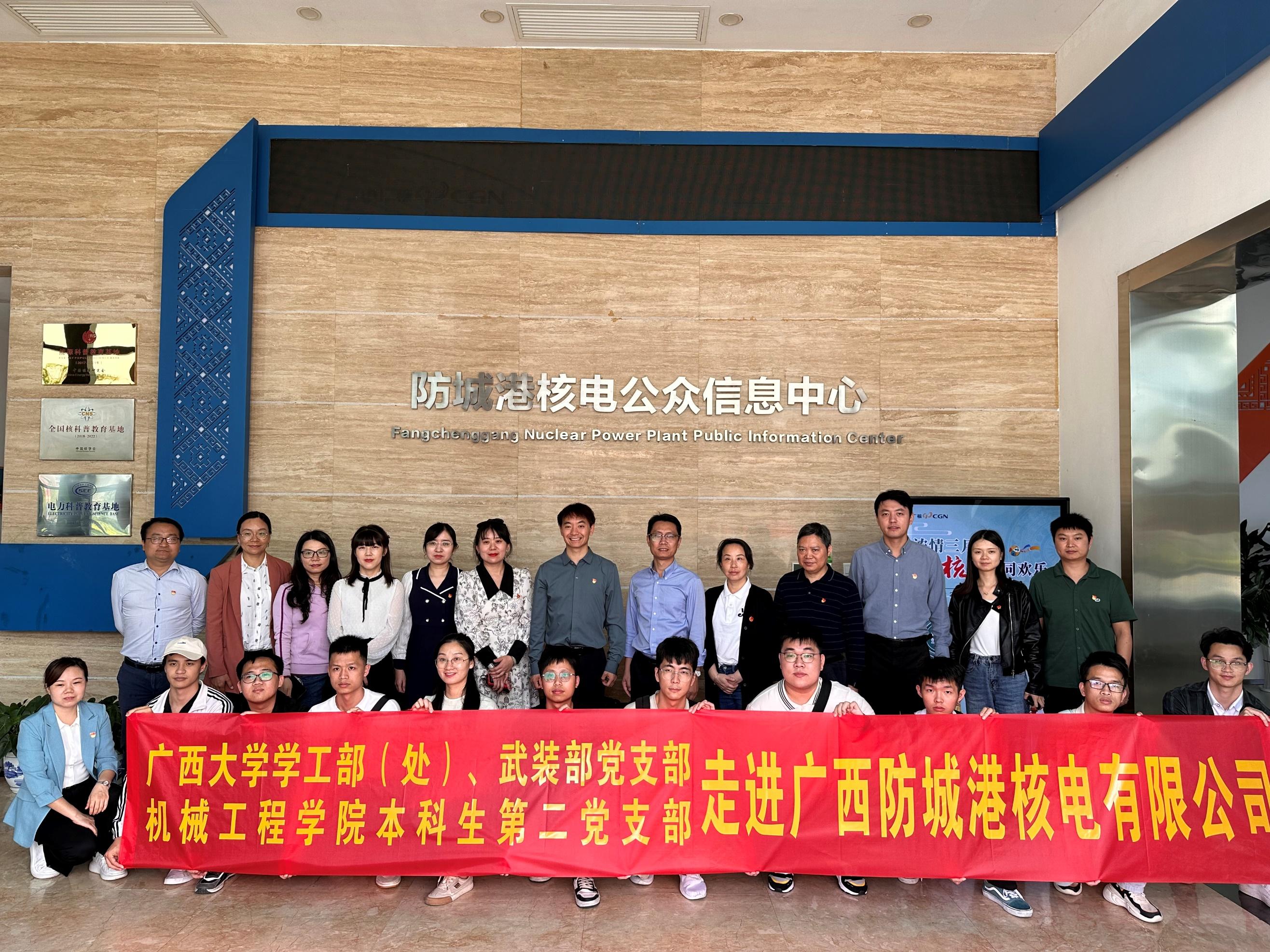 為貫徹落實(shí)黨中央關(guān)于在全黨大興調(diào)查研究的工作要求,2023年4月26日,我院本科生第二黨支部與學(xué)校學(xué)工部(處)、武裝部黨支部在學(xué)校學(xué)工部(處)、武裝部王利軍副部(處)長(zhǎng)的帶領(lǐng)下,共同赴防城港中廣核廣西防城港核電有限公司開展支部共建活動(dòng)。