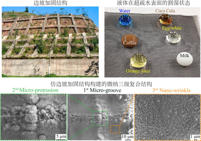 論文的第一作者為我院助理教授劉黎明,通訊作者為尤暉教授,廣西大學(xué)是論文的第一署名單位。該論文受山體“邊坡加固”結(jié)構(gòu)的(如圖1所示)啟發(fā),在金屬表面構(gòu)建了具有超疏水潤(rùn)濕特性的三級(jí)尺度微納金屬網(wǎng)膜結(jié)構(gòu),進(jìn)而開(kāi)發(fā)出一種機(jī)械強(qiáng)度大、耐久性強(qiáng)的新型超疏水多孔膜基材料,成功突破了上述技術(shù)瓶頸。實(shí)驗(yàn)表明,這種材料的超疏水微納結(jié)構(gòu)具有類(lèi)荷葉的自清潔功能,可抵抗生活中常見(jiàn)的液體如水、可樂(lè)、咖啡、雞蛋清液、果汁和牛奶等的潤(rùn)濕,具有優(yōu)異的防污能力。更重要的是,面對(duì)水射流沖擊,2000次循環(huán)摩擦,400℃高溫處理以及1.6噸汽車(chē)碾壓等嚴(yán)苛機(jī)械測(cè)試后,仍具有自清潔能力。此外,該超疏水金屬網(wǎng)膜具有油相/水相選擇超浸潤(rùn)特性,可自動(dòng)“識(shí)別”油相或水相選擇性通過(guò)(如圖2所示)。這種材料表面的高強(qiáng)度三級(jí)微納結(jié)構(gòu)有望克服油水分離技術(shù)中,由于液體高速?zèng)_擊而導(dǎo)致涂層與基底脫離的缺點(diǎn),在自清潔和油水分離應(yīng)用領(lǐng)域具有重大應(yīng)用價(jià)值。