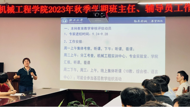 會上,對全體班主任進行培訓(xùn)。李俚副院長強調(diào)班主任和輔導(dǎo)員當(dāng)前主要的工作和學(xué)業(yè)幫扶的新手段。為了讓班主任更好地履行職責(zé)、引導(dǎo)學(xué)生學(xué)業(yè)發(fā)展和做好學(xué)業(yè)規(guī)劃,李俚副院長帶領(lǐng)大家學(xué)習(xí)了學(xué)院制定的班主任工作細(xì)則與考核辦法和學(xué)院四個本科專業(yè)的專業(yè)培養(yǎng)目標(biāo)與畢業(yè)要求。黃路明副書記根據(jù)學(xué)生發(fā)展的特點,對2023級新生班主任和輔導(dǎo)員進行了相關(guān)教育和工作布置。