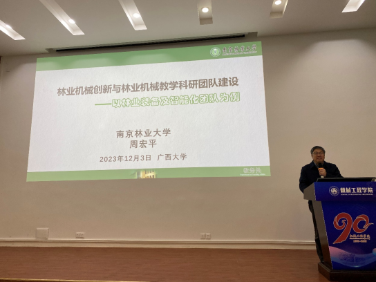 12月3日下午,周宏平教授為學(xué)院師生作“林業(yè)機(jī)械創(chuàng)新與林業(yè)機(jī)械教學(xué)科研團(tuán)隊建設(shè)”學(xué)術(shù)報告。周教授結(jié)合團(tuán)隊獲得的國家科技獎詳細(xì)介紹了林業(yè)植保、經(jīng)濟(jì)林果機(jī)械方面多年的豐碩研究成果,分享了其教學(xué)科研團(tuán)隊建設(shè)經(jīng)驗,讓師生們了解到林業(yè)機(jī)械的相關(guān)知識和前沿發(fā)展方向,開拓了師生的視野,使師生們受益匪淺,受到在場師生的廣泛好評。最后,周宏平教授與在場師生就林業(yè)機(jī)械創(chuàng)新與林業(yè)機(jī)械教學(xué)科研團(tuán)隊建設(shè)方面的問題進(jìn)行了互動交流與討論。