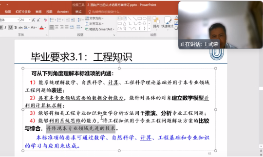 王武榮教授分別對機電,機自專業(yè)提出的兩版人才培養(yǎng)方案遵循的標準、課程體系支撐矩陣及畢業(yè)要求評價、體制機制文件的填寫與應(yīng)用、課程目標評價、實踐類課程評價提交的實性證據(jù)準備等問題進行了詳細的指導(dǎo)。針對專業(yè)認證標準的2020版、2022版的變化,王教授做了清晰的解讀,為人才培養(yǎng)方案的畢業(yè)要求觀測點關(guān)鍵措辭適應(yīng)性做出了清晰的指導(dǎo),對課程評價數(shù)據(jù)收集、評價方法以及申請書的支撐材料也進行了詳細的操作指導(dǎo)。王教授指出各專業(yè)申請材料的短板和進一步整理申請材料的要求,并表示將認真為各專業(yè)重新整理后的資料進行更詳細指導(dǎo)和把關(guān),為各專業(yè)組織更規(guī)范的資料提供更好的服務(wù)。