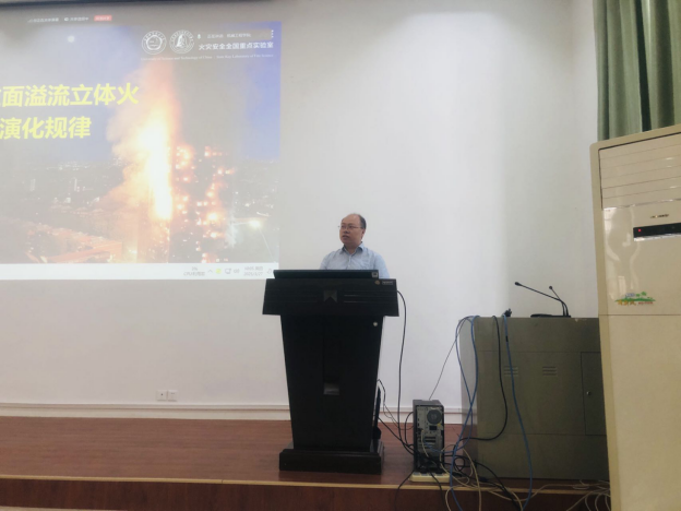 高層建筑外立面立體火災(zāi)是城市火災(zāi)與公共安全的重要挑戰(zhàn)。胡教授從室內(nèi)火災(zāi)行為、外立面火溢流臨界理論、火溢流特征參數(shù)演化和城市大尺度高層建筑立體火等四個(gè)層面,對(duì)環(huán)境風(fēng)作用下高層建筑火災(zāi)燃燒行為進(jìn)行了系統(tǒng)介紹,為師生講解了環(huán)境風(fēng)、低壓、不同外墻結(jié)構(gòu)等邊界條件下的開(kāi)口火溢流及外立面立體火行為,揭示了外立面火溢流發(fā)生機(jī)制、火焰高度、溫度、熱流分布等參數(shù)的數(shù)理模型及城市大尺度災(zāi)害演化機(jī)理。