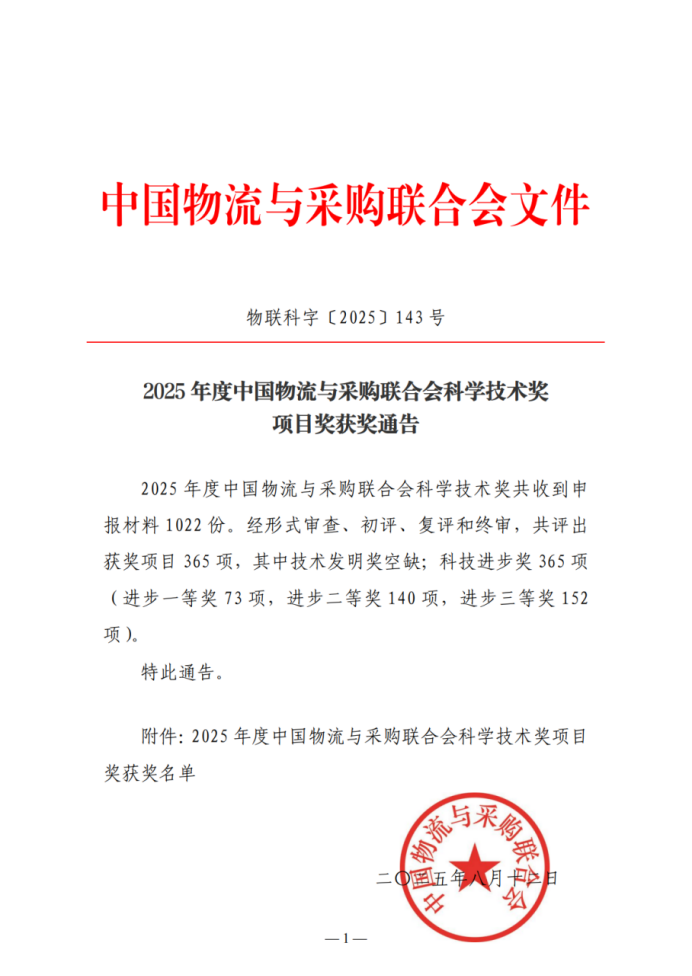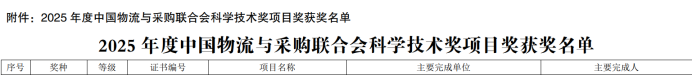 我院科技成果榮獲2025年度中國物流與采購聯(lián)合會科學(xué)技術(shù)獎科技進步一等獎 |